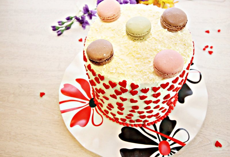 Punem prima sectiune de blat in inelul tavii de 19 cm in care am copt blatul. Insiropam prima sectiune cu marginea blatului de vanilie, cu apa+zahar. Pastram 3-4 linguri de crema neagra si apoi punem toata crema ramasa. Nivelam bine. Adaugam a doua sectiunea cu marginea blatului de cacao. Insiropam. Pastram 4 linguri de crema alba, iar apoi punem toata crema ramasa. Nivelam bine. Pastram 4 linguri de crema de zmeura. Peste crema alba pe care am nivelat-o, adaugam crema de zmeura. Adaugam sectiunea a treia, cu marginea blatului de vanilie. Adaugam cele 3 linguri de crema de ciocolata neagra. Nivelam. Amestecam cele 4 linguri de crema de ciocolata alba cu cele 4 linguri de crema de fructe. Adaugam amestecul obtinut peste crema de ciocolata neagra. Insiropam ultima sectiune si o punem deasupra amestecului de ciocolata alba+crema de zmeura. Am acoperit tortul cu folie de prospetime si l-am lasat peste noapte in frigider. L-am imbracat in crema de unt (300 g unt+120 g zahar pudra). L-am decorat cu inimioare de zahar, perle si deasupra am ras ciocolata alba si macarons.