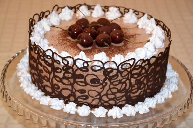 Cu un pos, pui cateva moturi de frisca pe tort, apoi ornezi cu cirese.
