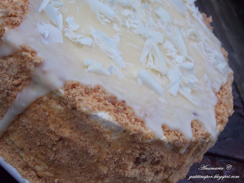 Procedati astfel si cu cele doua blaturi ramase apoi imbracati tortul in crema ramasa si dati la frigider pentru 20-30 de minute.