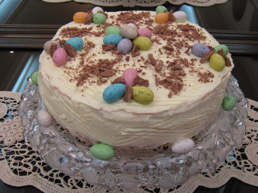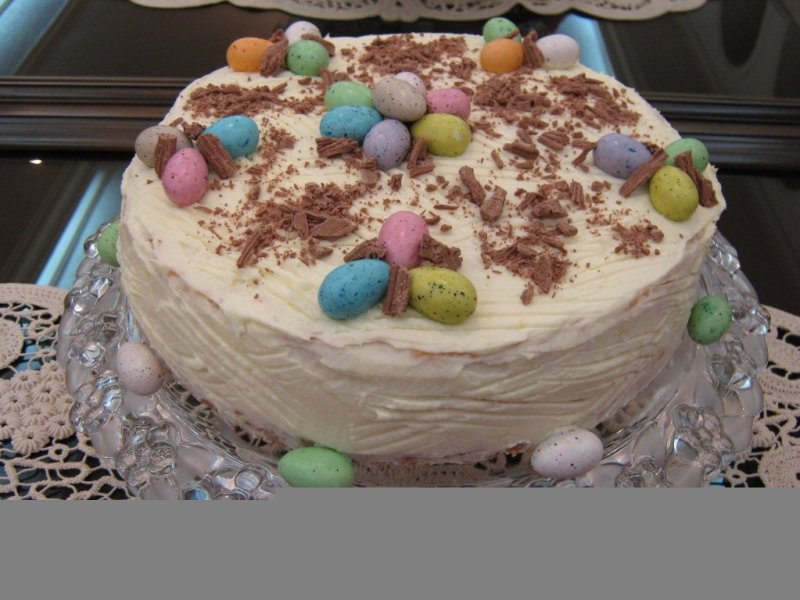 Se umple blatul cu crema si se decoreaza cu ouale si fulgii de ciocolata.