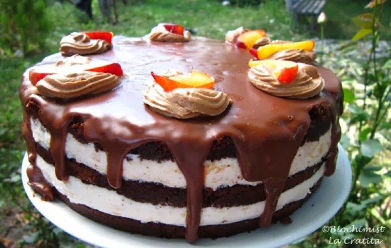 Asamblam tortul punand prima felie intr-un inel reglabil (pentru torturi), insiropam, punem jumatate din crema, a doua felie, insiropam, punem restul de crema de nectarine si ultima felie pe care o vom insiropa. Introducem in frigider pentru cel putin 4 ore. Scoatem forma, punem glazura deasupra si crema de ciocolata.