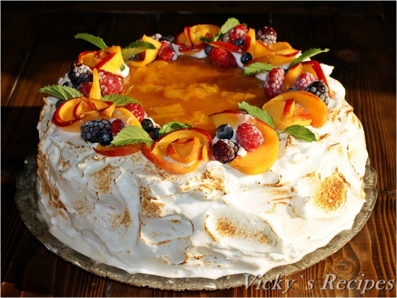 -Înainte de servire, tortul se decorează/ornează după dorință și inspirație, în funcție de ocazie, cu frișcă, fructele preferate, etc. Eu am optat pentru acest jeleu acrișor și aromat de caise, glazura de bezea acrișoară, fructe și frunze de mentă.