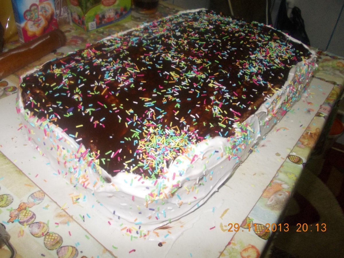 Blatul: Se bat albusurile spuma tare apoi se adauga zaharul, galbenusurile si la final faina amestecata cu praful de copt. Se pune la copt in tava tapetata cu hartie. Cand e copt il scoatem si il lasam la racit apoi il taiem in doua, il insiropam si punem crema.