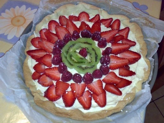 intr-o tava rotunda tapetata cu hirtie, se intinde coca care se inteapa din loc in loc cu furculita, se acopera cu aluminiu,un strat de fasole boabe uscate pt a nu-i permite cresterea, dupa 15 min se scoate fasolea si se pune din nou la cuptor pt 5 min fara aluminiu. Cand se raceste se umple de crema, se orneaza cu fructe de sezon.
