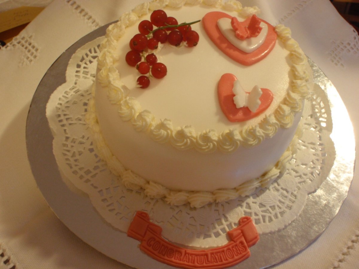 Cind blatul e deja rece se pune un strat generos de frisca pe primul blat, se adauga capșuni taiate cubulete nu ff mici apoi se adauga al doilea blat si se imbraca tortul in friscă. Se dă la rece aprox 2 ore(eu il las peste noapte) si apoi se definitiveaza cu ce ornamente doriți. Mie imi place sa il imbrac frumos intr-o mantie de fondant si il ornez cu fructe si decoratiuni din fondant si frișcă..:)