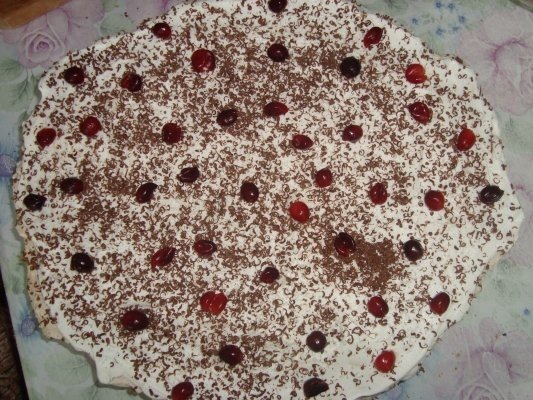 Apoi se insiropeaza primul blat si se pune un strat de frisca cu ness.Urmeaza al doilea strat care se insiropeaza si el si se pune frisca cu ness ramasa si peste frisca simpla. Se rade ciocolata deasupra si peste se pun ciresele.