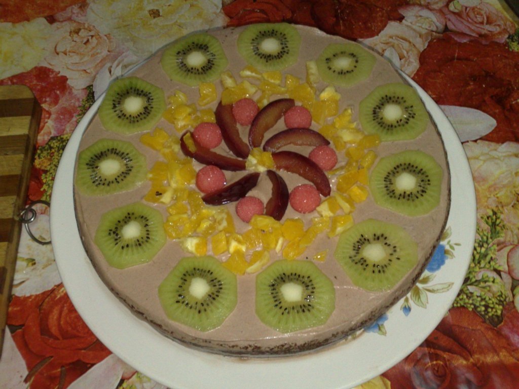 Asamblare: Se taie blatul in 3 parti, de preferat cu un cutit zimtat, pe primul strat(siropat) se pune jumatate din cantitatea de frisca peste care se pun prunele, se aseaza al doilea blat, se siropeaza si el, se adauga frisca si kiwi taiat, se aseaza si ultimul strat, se siropeaza si acesta, se pune frisca cu cacao(cea pe care am oprit-o la inceputul procesului se ansamblare) si se orneaza dupa imaginatie.