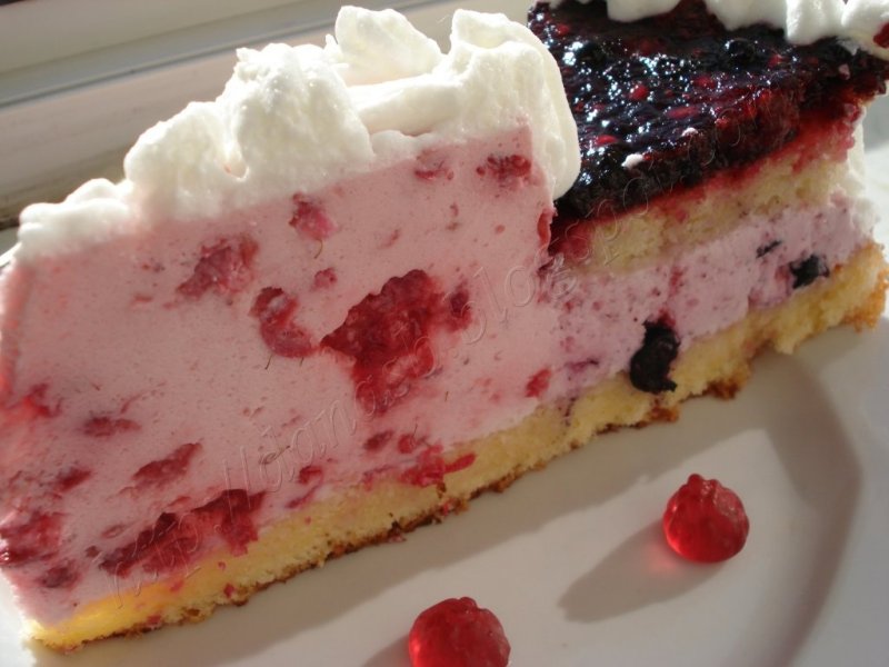 Urmeaza sa punem jeleul de fructe,care-l pregatim in felul urmator,amestecam fructele(afine+zmeura) cu zaharul,punem vasul pe foc,pana se infierbanta bine si atinge punctul de fierbere..Luam vasul deoparte si in compozitia de fructe,presaram praful de tort gelee,amestecam bine,iar compozitia rezultata o punem deasupra tortului de jur imprejurul formei mici cu crema de zmeura..