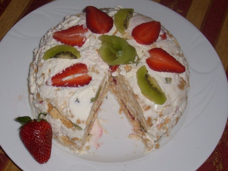 - Se unge pelicula cu un strat de Crema apoi urmeaza un Strat de fructe, dupa care Biscuiti maruntiti si iarasi Crema si tot asa mai departe.