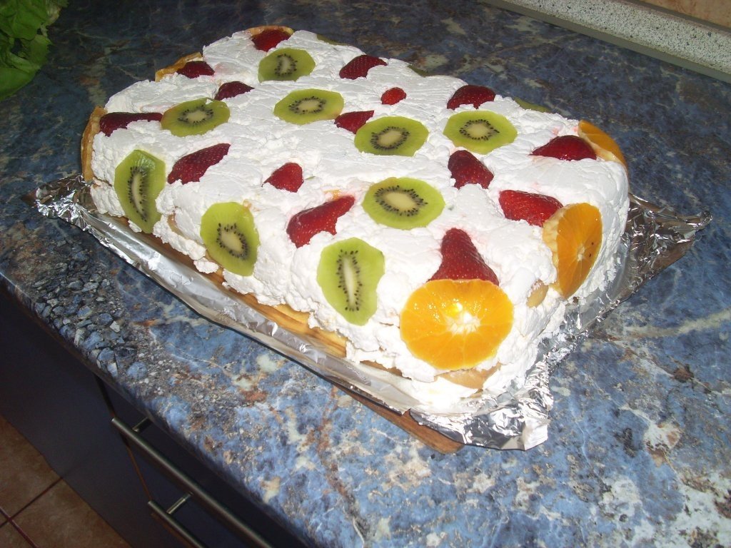 Gelatina se dizolva in 50ml de apa calduta.Intr-un bol se amesteca iaurtul cu gelatina dizolvata. Frisca se bate si se amesteca cu iaurtul. Se taie fructele rondele iar capetele ce raman le taiem marunt si le punem in frisca. Intr-o tava se pune celofan umezit atat pe pereti cat si pe fundul acesteia iar apoi se orneaza cu fructele taiate rondele. Peste fructe se adauga un strat de frisca se pune un rand de piscoturi inmuiate si tot asa pana se termina cu un strat de piscoturi. Tortul se baga la rece si se rastoarna a 2-a zi.