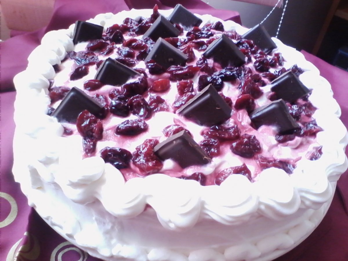 Blatul de tort se taie orizontal in trei parti.Se pune pe un platou baza tortului si se stropeste cu sirop.Intr-un castron se amesteca gemul de visine cu 5-6 linguri pline de frisca.Se amesteca usor , iar jumatate din compozitie se pune peste blatul insiropat.Urmeaza a 2-a parte de blat care se insiropeaza .Se pune cealalta jumatate de crema si se adauga ultima parte de blat stropit cu putin sirop.Tortul se imbraca in frisca ,iar deasupra se pun visinele scoase una cate una din sirop.Ciocolata se rupe in patratele si se pune printre visine.Se termina decorarea
