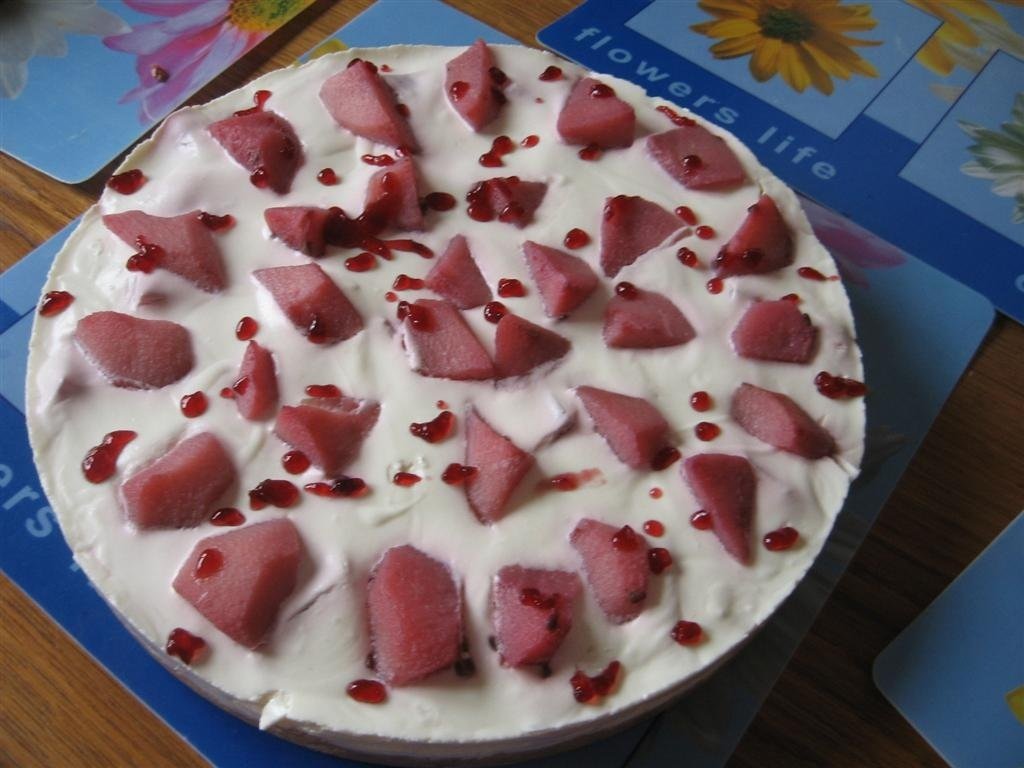 Fructele din tort ar fi trebuit sa fie proaspete dar cum este iarna si capsunile proaspete au gust de nimic, atunci am fiert 3 pere (curatate si taiate cubulete ) in 300 ml de vin rosu si 2 linguri de zahar (ele s-au colorat foarte frumos si au un gust deosebit de vin ) .
