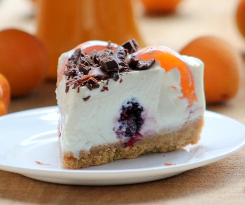 Se scoate tava de la frigider, se așază pe margine jumătăți de caise, în mijloc se asaza murele, apoi se toarnă compoziția de iaurt, cu atenție să nu cadă fructele. Se dă la rece pentru câteva ore.