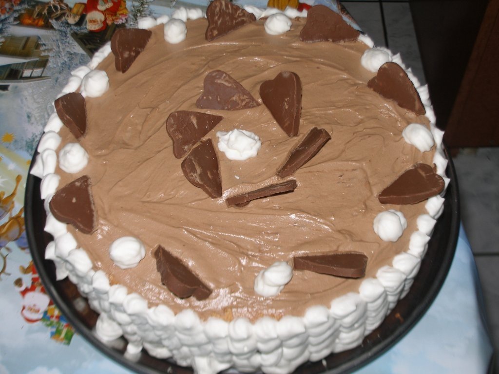 Se bat albusele spuma, se adauga zaharul, galbenusurile, amestecand usor, se adauga faina, cacaua si praful de copt se pune in forma rotunda tapetata si se da la cuptor amestecul. Cand e copt se taie in 3 felii si se insiropeaza cu un sirop facut din apa si zahar. Pentru crema se bat ouale cu zahar pe aburi se pune cacaua si se lasa pana se ingroasa. Cand crema e rece se adauga la o margarina frecata spuma. Ce intinde crema peste blaturi si se rade si o ciocolata peste crema. Se topeste o ciocolata si se pune pe o farfurie unsa cu margarina se lasa sa se raceasca apoi se taie cu forma inimioare.se orneaza tortul cu frisca si cu inimioare .