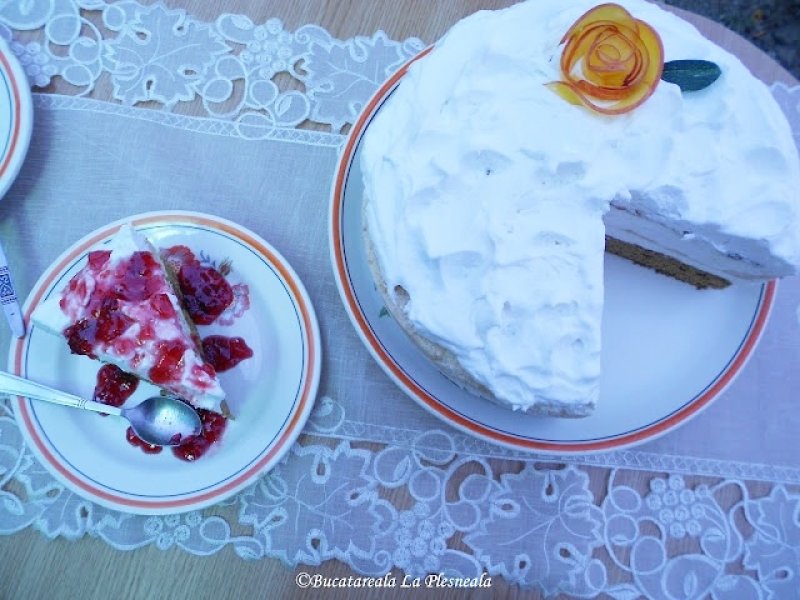 1. Tapetati o tava detasabila cu folie alimentara si puneti blatul in tava. Deasupra blatului puneti 1/2 din compozitia de frisca cu iaurt, puneti apoi piureul de fructe, si restul de frisca cu iaurt. Nivelati dupa fiecare strat pus.