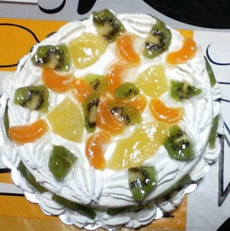Înmoi gelatina, într-un castron, cu apă călduţă şi o laşi să se umfle 20-25 de minute. Amesteci gelatina topită şi răcită cu iaurtul, zahărul vanilie şi adaugi treptat frişca. Baţi bine să se amestece. Scurgi fructele din compot şi le tai felii. Taiem felii kiwi si portocala. Amesteci cu frişca jumătate din cantitatea de fructe şi păstrezi restul pentru decorare. Tapetezi interiorul unei forme de tort detaşabile cu folie de aluminiu să nu se lipească de frişcă şi acoperi fundul formei de tort cu pişcoturi. Torni frişca amestecată cu fructe, nivelezi frumos la suprafaţă şi ornezi cu feliile de frcute păstrate. Laşi tortul la rece până în momentul servirii.