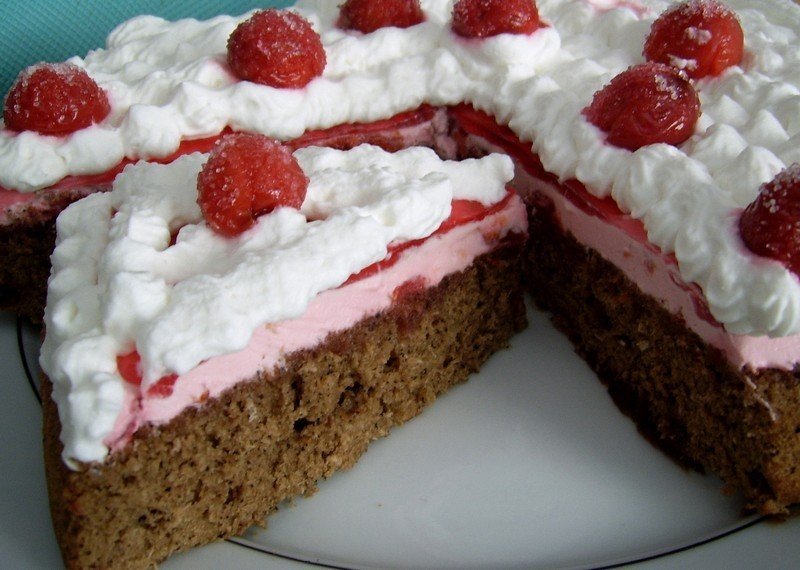 Peste blat se intinde crema, se nivelează bine. Deasupra se toarnă gelatină roșie pt decor( obțional),apoi se dă la rece. Se ornează cu frișcă și vișine.