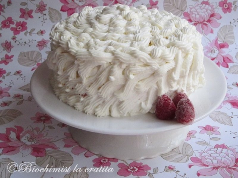 1. Taiem tortul, punem o felie de blat pe un platou intr-un inel detasabil (uns cu putin ulei), o insiropam, punem apoi zmeura pe margine (daca aveti mai multa zmeura puteti "tapeta" tot blatul cu ea) si crema in centru. Punem apoi urmatorul blat si il insiropam. Bagam tortul la frigider minim 4 ore. La mine a stat mai mult (12 h).