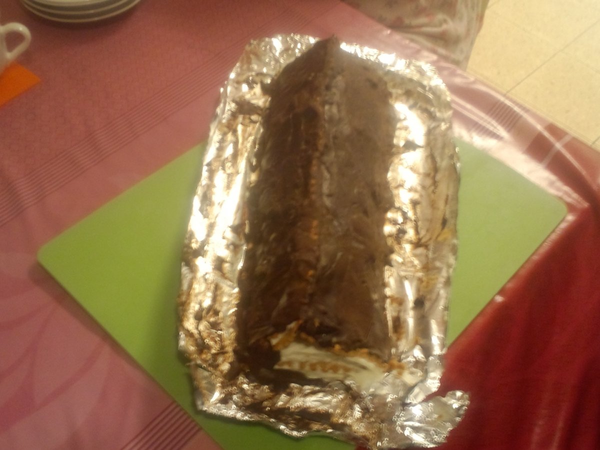Pe o plansa se intinde o folie de aluminiu si se pun 3 straturi de biscuiti unul langa altul - biscuitii ii inmuiem in putin lapte. Peste biscuiti punem un strat de crema, iar peste crema punem un strat de biscuiti, dupa care punem crema numai pe stratul de mijloc de biscuiti si ridicam lateralele de biscuiti cu crema formand un trigon - este bine sa punem crema indeajunsa pe mijloc pentru ca atunci cand formam trigonul crema sa fie pana sus. Acoperim bine cu foaia de aluminiu si lasam pe plansa la rece cel putin cateva ore.
