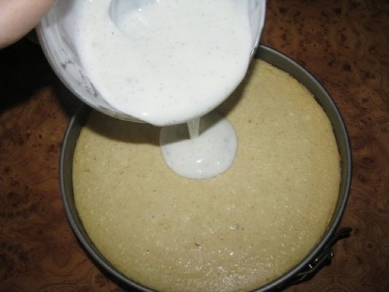 2. Intre timp prepara umplutura.Amesteca iaurtul cu semintele de vanilie. Amesteca bine branza cu zaharul, faina, vanilia , ouale si 300 gr iaurt.Torna amestecul obtinut in tava si da prajitura la copt 10 minute la 180ᵒC, apoi mai las-o 30-40 minute la 140ᵒC.Cand va fi gata, umplutura va fi inca usor moale si se va misca daca o vei scutura.