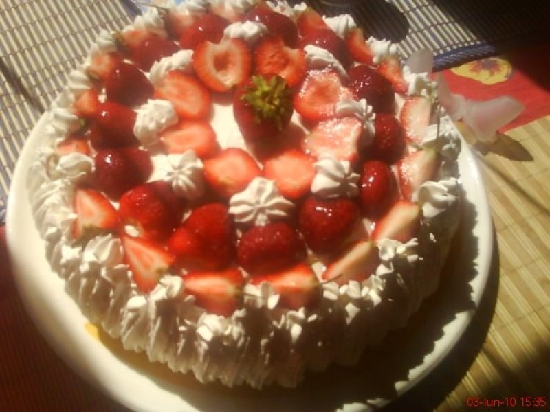 Blatul: se bat albusurile spuma si dupa ce s-au intarit se adauga zaharul cite putin, apoi galbenusurile cite unul, faina si cacaoa cernute si la urma uleiul. Se coace la foc mediu aproximativ 40-45 minute apoi dupa ce s-a racit se da la frigider pentru 2 ore. Se taie in trei parti.Crema: se mixeaza capsunile si se amesteca usor cu frisca si gelatina preparata dupa indicatiile de pe pachet. Se da la frigider pentru 30 minute. Siropul pregatit din zahar , apa si esenta de vanilie se fierbe 2 minute apoi se lasa sa se raceasca. Se insiropeaza cele trei discuri ale blatului, se intinde jumatate din crema pe primele doua discuri, se orneaza cu frisca si capsuni dupa dorinta si se lasa la frigider pina in momentul servirii.