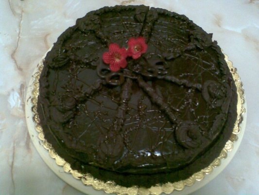 Ciocolata se rupe se adauga frisca si untul si se pune la foc pana ciocolata s-a topit.Se lasa sa se raceasca putin apoi se toarna peste tort.