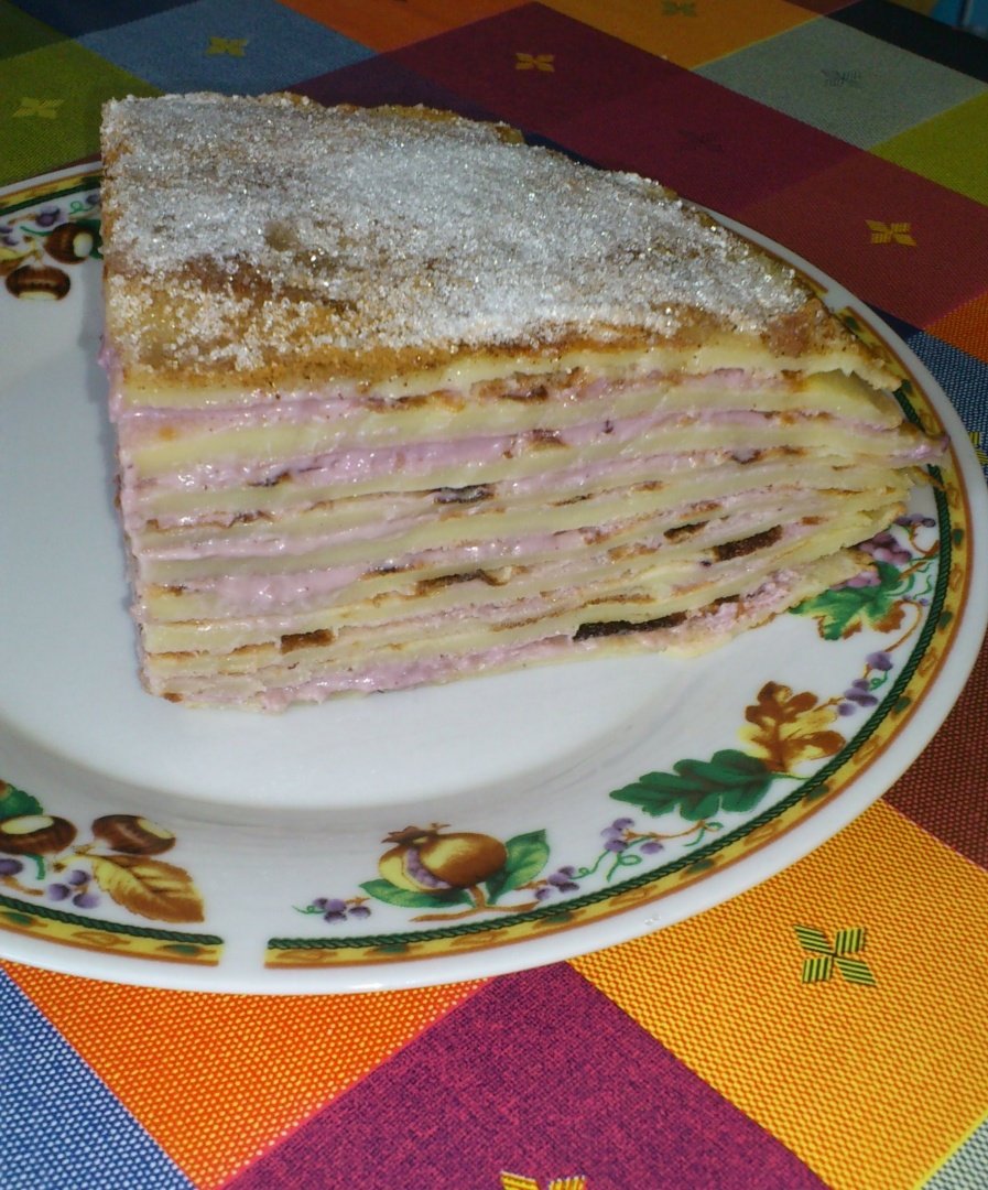 Se pune prima clatita si peste se pune 1 lingura de crema si se intinde, apoi se pune a 2 a clatita si alta lingura de crema si tot asa pana se termina clatitele. Peste clatita deasupra se pudreaza cu zahar pudra si scortisoara in pudra.