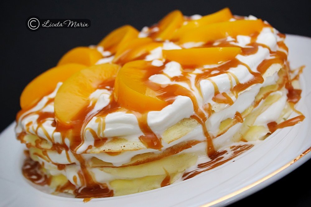 Tort de clatite cu piersici din compot, frisca si sirop caramel - un desert rapid, delicios si usor de preparat. Combinatia perfecta de clatite fine, piersici dulci, frisca fina si sirop caramel, il face ideal pentru orice ocazie.