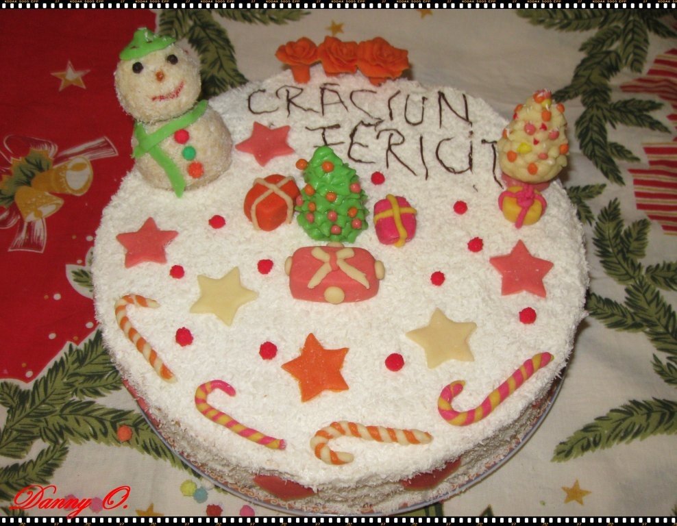 Eu am facut un om de zapada, 2 braduti (le-am facut crengutele, folosindu-ma de o forfecuta), acadele, stelute, inimioare (pe care le-am pus pe marinea tortului), trandafiri si cateva cutii de cadouri. Craciun fericit tuturor!