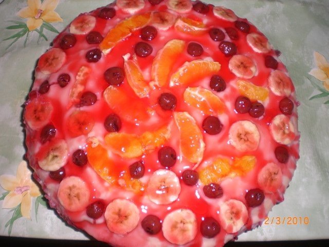 Peste budinca se pun fructele iar peste fructe se toarna gelatina. Se lasa la racit apoi se poate pastra la rece in frigider.