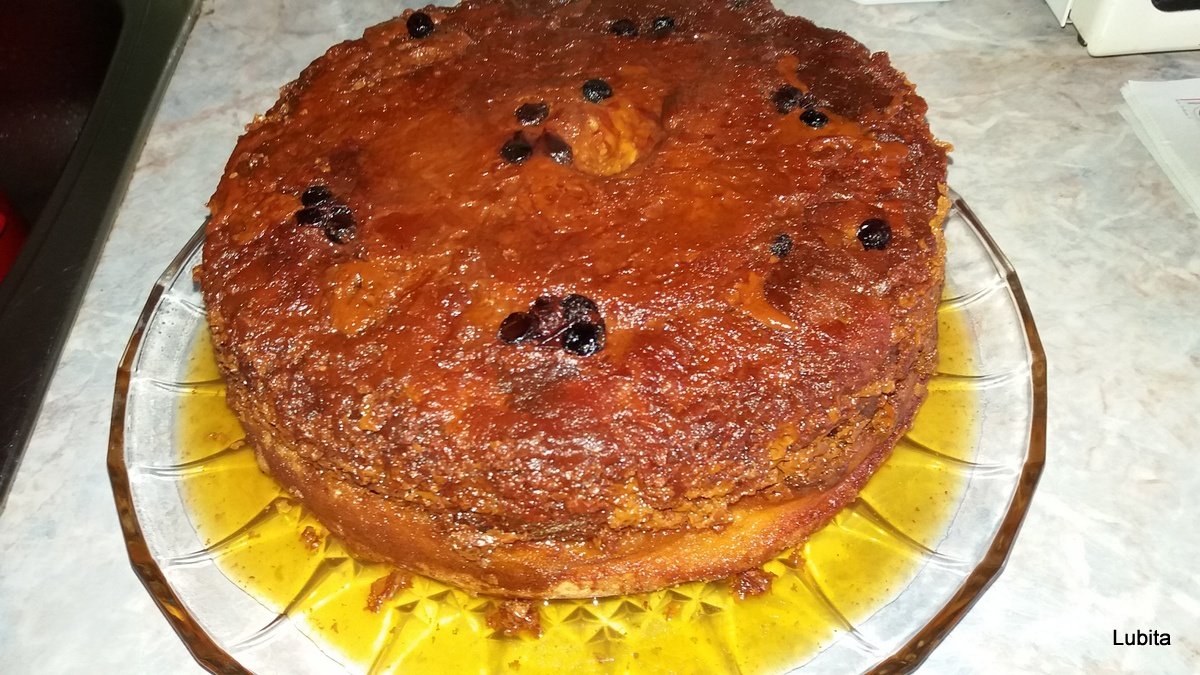 Dupa ce s-a copt, se scoate vasul din cuptor,se acopera cu un prosop de bucatarie 20min, apoi cu foarte mare atentie se rastoarna pe un platou mai mare si se lasa la frigider sa se raceasca foarte bine