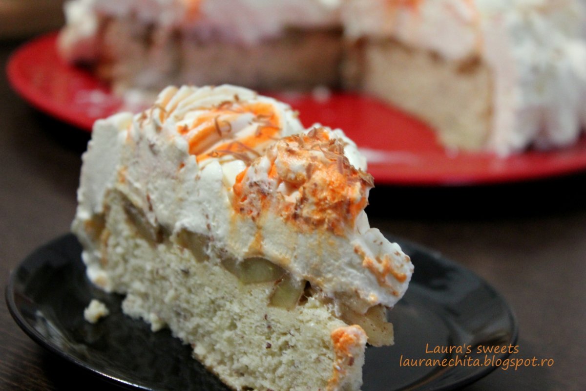 Dupa ce s-a racit blatul de tort, l-am rasturnat pe un platou mare, cu partea cu mere in sus. L-am insiropat cu siropul de mere si apoi l-am imbracat si ornat cu frisca si ciocolata rasa.