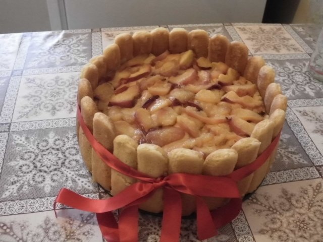 Tapetam o forma de tort cu marginile detasabile cu piscoturi inmuiate in compot de piersici. Se pun piscoturi si pe margini si pe fundul tavii.