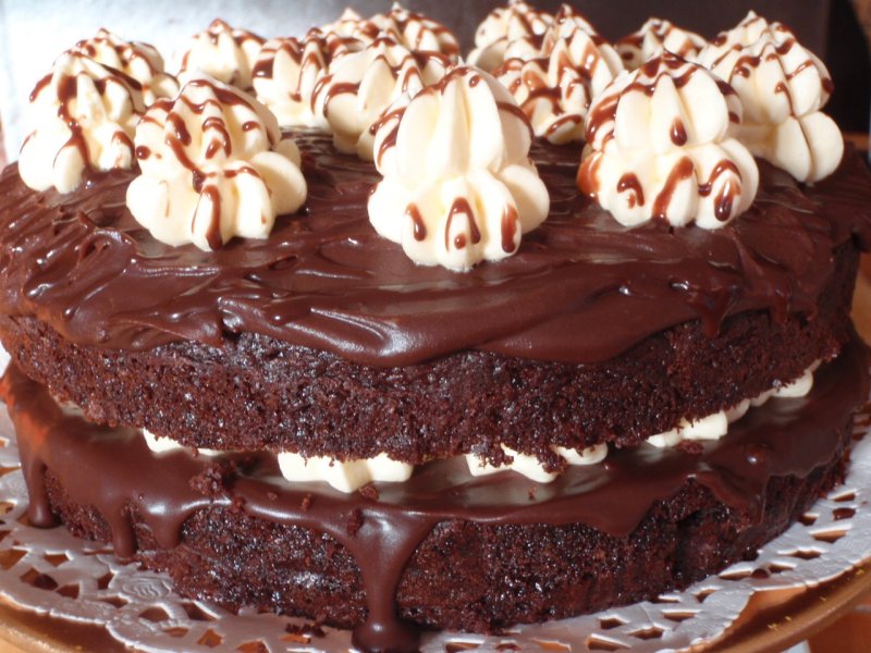Ornarea e extrem de simpla..asta daca va place cum am ales eu sa il ornez...:) adică taiem blatul in doua părti egale, punem pe primul blat un strat generos de ciocolata, apoi cu ajutorul unui pos punem crema, iar blat, iar ganache si ornam cu crema...si rezultatul..tadaaa....e diviiiinnn.