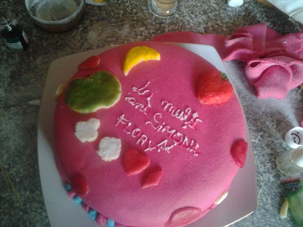 Punem bezelele pe bain-marie pana se topes, adaugam colorantul alimentar, apoi amestecam cu zaharul pudra pana nu mai putem sa amestecam cu lingura, apoi le punem pe masa si o lucram ca pe o coca, se lasa la frigideri minim 3 ore. Apoi preparam crema de vanilie si o punem la frigider, 100 g de unt il mixam cu fructele decongelte apoi amestecam cu jumatate din crema de vanilie pana obtinem o consistenta tare. Desfacem platul il insiropom, si il umplem cu crema. Dam tortul la frigider timp de 2 ore dupa care il invelim in fondant si ne jucam cu anumite forme. Pofta buna!
