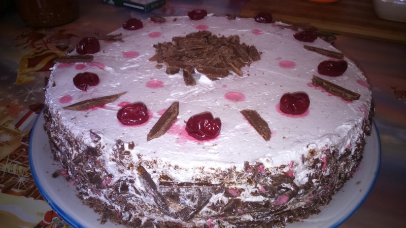 Apoi imbracam tortul cu frisca, tocam o tableta de ciocolata si ornam tortul pe margini, punem si cateva visine pentru ornare si cateva aschii de ciocolata. Se da la frigider 5-6 ore.