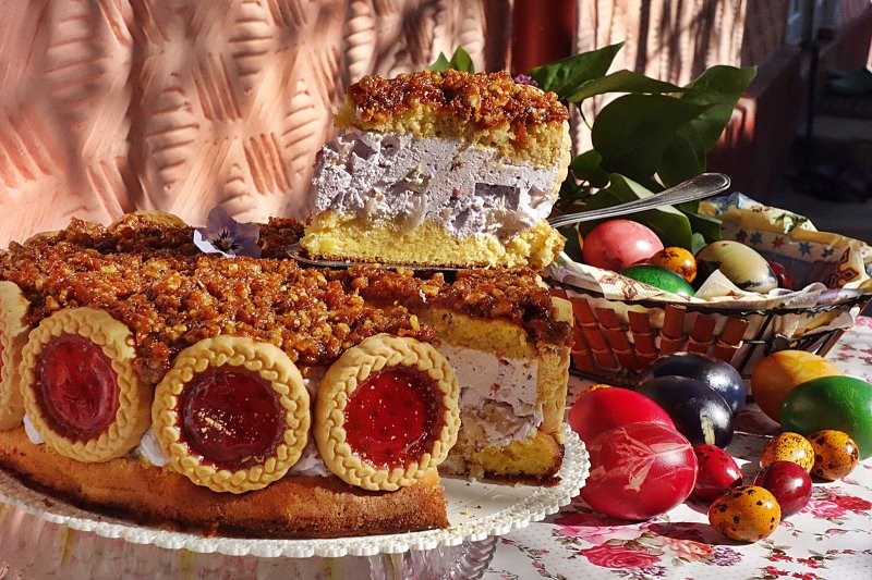Se insiropeaza primul disc asezat in forma, cu siropul de ananas, se asaza biscuitii pe marginea formei, cu jeleul spre exterior, apoi se asaza crema obtinuta din smantana pentru frisca mixata pana se intareste, amestecata cu dulceata de coacaze, apoi se adauga ananasul scurs bine si gelatina hidratata in 100 ml apa rece si apoi topita la bain marie. Se fixeaza deasupra cremei si cel de-al 2 lea disc de blat insiropat cu siropul de coacaze. Se lasa la rece, cel putin 2 ore. Se caramelizeaza zaharul, apoi adaugam miezul de nuca maruntit. Dam craticioara de pe foc si adaugam ouale batute, amestecand in continuu pana la o omogenizare perfecta. Krantzul fierbinte il intindem deasupra prajiturii care este inca in forma. Se mai lasa cca. 30 minute la rece, inante de a-l scoate din forma.