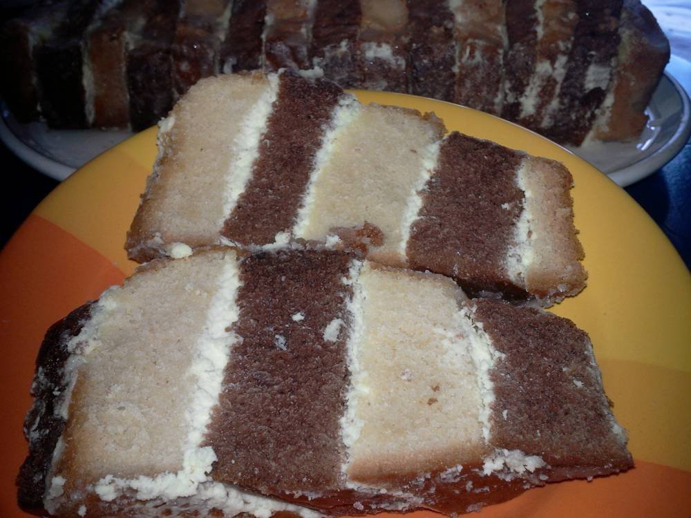 Lasam checurile sa se raceasca si le taiem felii. Umplem fiecare felie de chec (una alba- una maro) cu crema de lamaie, pe care o preparam conform instructiunilor de pe ambalaj pana ce terminam de umplut toate feliile.