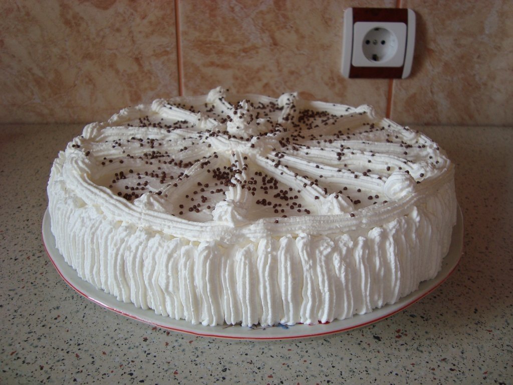 Tai blatul in doua sau trei si il umpli cu crema.Apoi imbraci tortul cu frisca batuta bine.