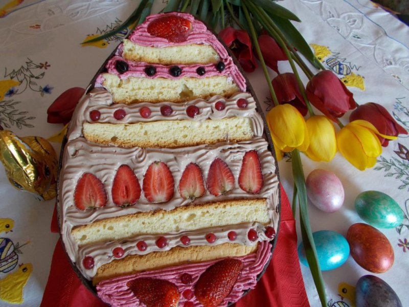 Am umplut spatiile dintre cu crema de vanilie, crema de fructe de padure si fructe pentru o jumatate din ou, iar la cealata jumatate, am folosit crema de ciocolata, crema de fructe de padure si fructe.