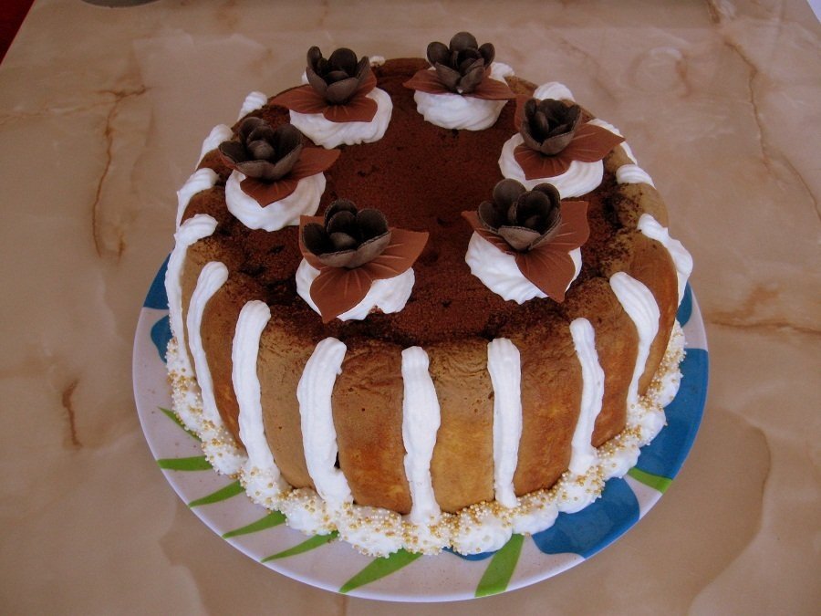 Freci untul cu zaharul bine de tot, adaugi galbenusurile, cacaua si albusurile batute spuma. Ungi cu unt si tapetezi cu folie de plastic alimentara o forma mica de tort. Asezi piscoturile trecute, in prealabil, prin lapte, pe marginea formei (daca este nevoie le rupi pentru a se potrivi cu inaltimea formei). Torni crema iar deasupra mai pui un rand de piscoturi inmuiate in lapte. Lasi pana a doua zi la frigider, apoi rastorni tortul pe un platou si il decorezi cu frisca.