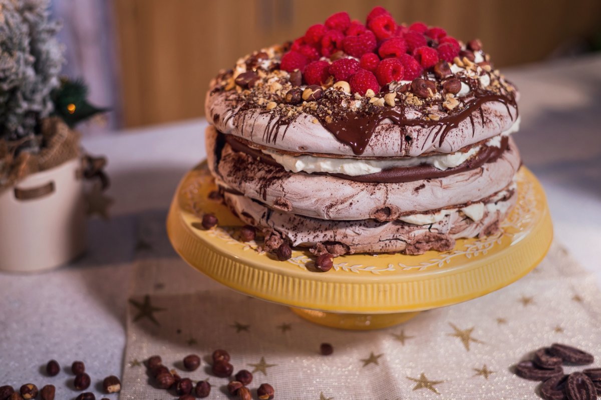 Pentru a monta, puneti intai un pic de frisca pe mijlocul platoului, pentru ca blatul sa nu alunece si puneti prima foaie de bezea. Turnati 1/3 din crema de ciocolata. Puneti apoi frisca, cat sa acopere tot blatul. Presarati alune de padure pisate. Puneti apoi urmatoarea foaie de bezea, ganache-ul de ciocolata, alunele si frisca. Repetati pentru ultima foaie de bezea. La ultima, puneti mai putin frisca, sa nu pice pe margini. Decorati apoi cu ciocolata topita. Alune pisate si alune si zmeura.