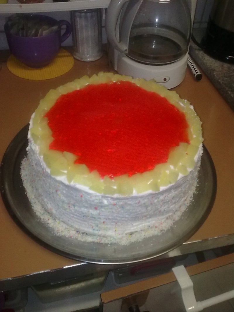 Acoperim cu frisca tot tortul si desupra punem gelatina rosie,apoi ornam cu frisca ramasa.