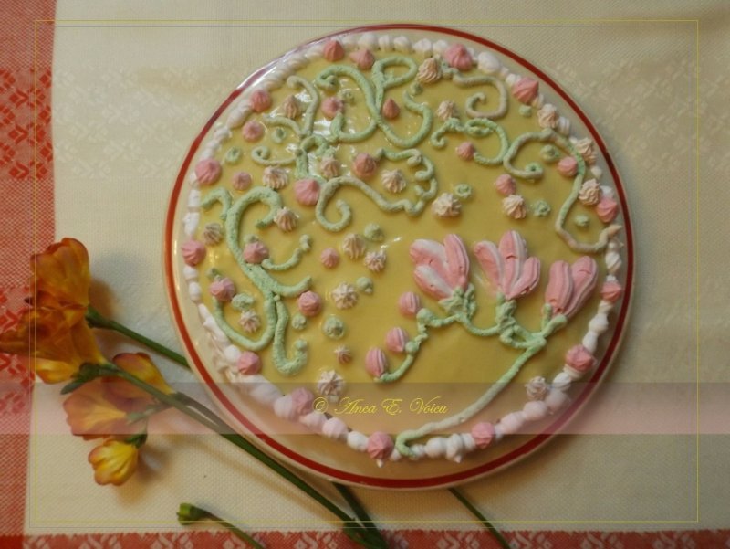 Se orneaza tortul cu frisca, creand flori si diferite motive. Pentru a colora frisca, am folosit coloranti alimentari.