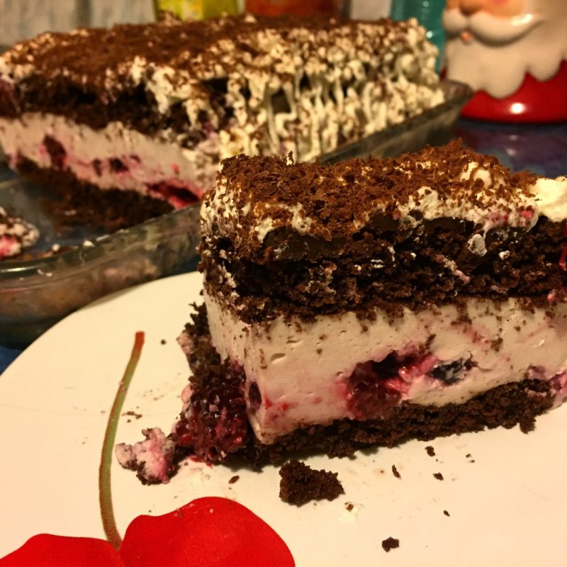 Asamblare- pe un platou se asaaza blatul și se atașează pereții detașabili de la tava, se insiropeaza blatul, se pune jumătate din crema, se pun fructele pe toată suprafața tortului, apoi se adaugă restul de crema, se pune și celălalt blat și se insiropeaza. Se decorează după preferințe. Eu am facut o glazura de ciocolata și apoi l-am decorat cu frișcă așa. Se topește ciocolata pe baie de aburi împreuna cu untul și laptele, se toarnă peste tort, se da la frigider cât sa se răcească. Între timp se bate frișca tare. Când s-a racit glazura, se decorează cu frișcă și se rade ciocolata peste.