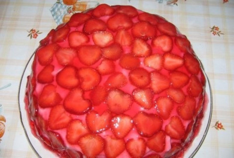 Tai fructele pe jumătate. Tapetezi forma de tort cu pişcoturi uşor înmuiate în lapte. Amesteci praful de budincă cu zahărul şi 200 ml lapte şi fierbe la foc mic. Apoi prepara gelatina pentru decor. Pui budinca peste pişcoturi, aranjezi fructele peste, toarnă gelatina şi pune la frigider pentru 30 de minute.