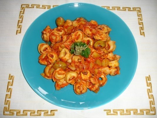 Ceapa si usturoiul se toaca marunt si se calesc intr-un wok sau o tigaie mai mare si apoi se adauga dovlecelul curatat si taiat cubulete mici. Dupa ce am calit bine se adauga si morcovul dat prin razatoarea mare. Se adauga si maslinele (eu am pus si felii si intregi sa arate bine). La sfarsit se adauga bulionul dizolvat in putina apa fiarta atat cat sa acopere dovlecelul. Se adauga patrunjel tocat, frunza de telina, busuioc si cimbru cate putin din fiecare pentru gust. Se fierb legumele sa fie "al dente" sau cine prefera de tot. Se pune la fiert 1 l de apa cu sare si se pun pastele in apa in momentul fierberii. Se lasa vreo 15 minute dupa care se scurg si se pun peste sosul fiert. Se mai calesc pastele cu sosul si se adauga branza dupa gust. Atentie la sare, caci maslinele si branza sunt destul de sarate.