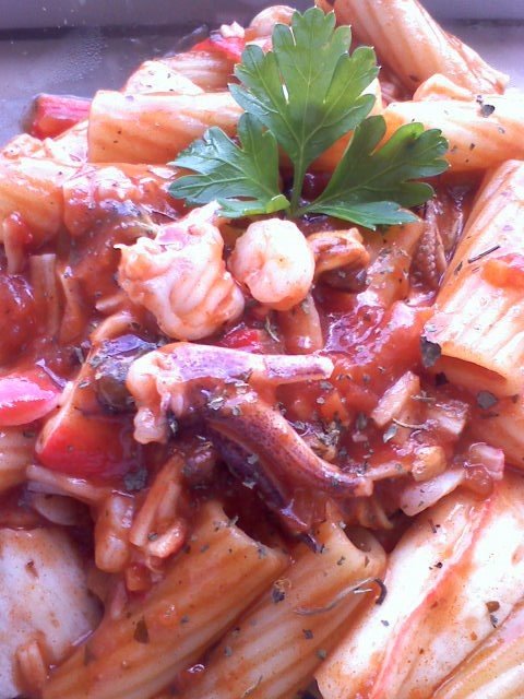 Nu am mai scris cantitatea pentru ultimul ingredient deoarece la mine au fost mult mai multe decat erau necesare (le pregatisem pentru altceva).Am fiert pastele in apa cu sare pentru fix 12 minute cum scria pe ambalaj.Marturisesc faptul ca este prima data cand respect timpul scris pe ambalaj pentru ca mie imi plac mai fierte.Le tin aproape mereu cu 1-2 minute mai mult.Cand pastele s-au fiert le-am scurs dar am mai pastrat putina apa.Peste paste am adaugat fructele de mare, sosul de rosii si busuioc si am mai tinut pentru inca 3 minute.Ar fi fost excelent busuioc proaspat dar nu am gasit pe nicaieri.