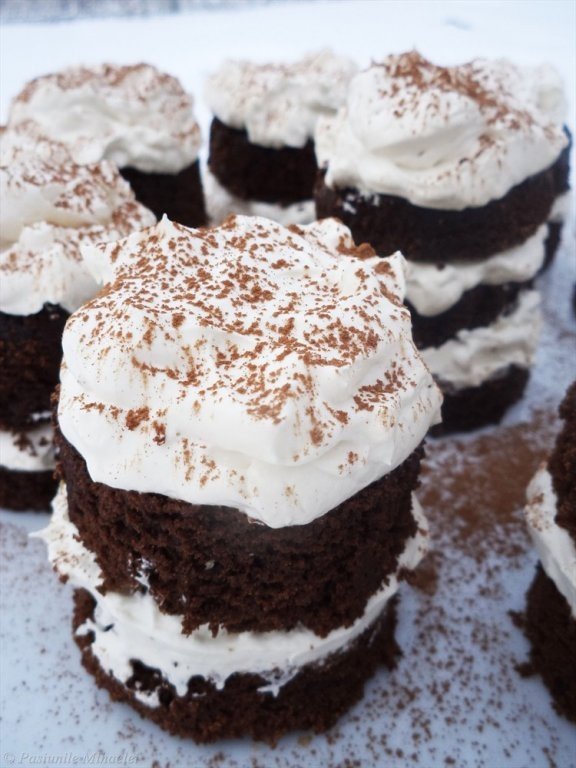 Puneti compozitia in formele unse si tapetate cu cacao.Coaceti cam 25-30 minute pentru o forma normala, facand testul cu scobitoarea. La mine a durat mai putin coacerea, datorita formelor mici. Nu uscati prea tare blaturile. Scoateti si raciti.