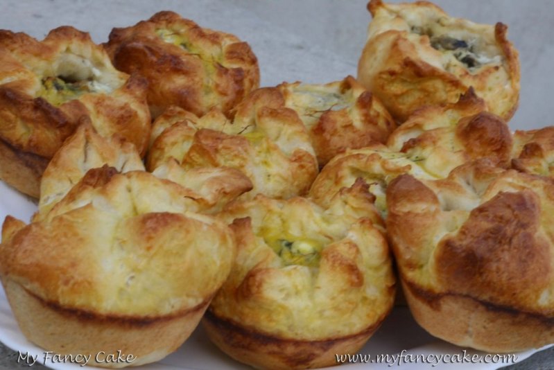 Intindem aluatul intr-o foaie groasa de aproximativ 1 cm si taiem cercuri cu diametru de aproximativ 15 cm. Cercurile le asezam intr-o tava de muffins unsa in prealabil cu ulei.